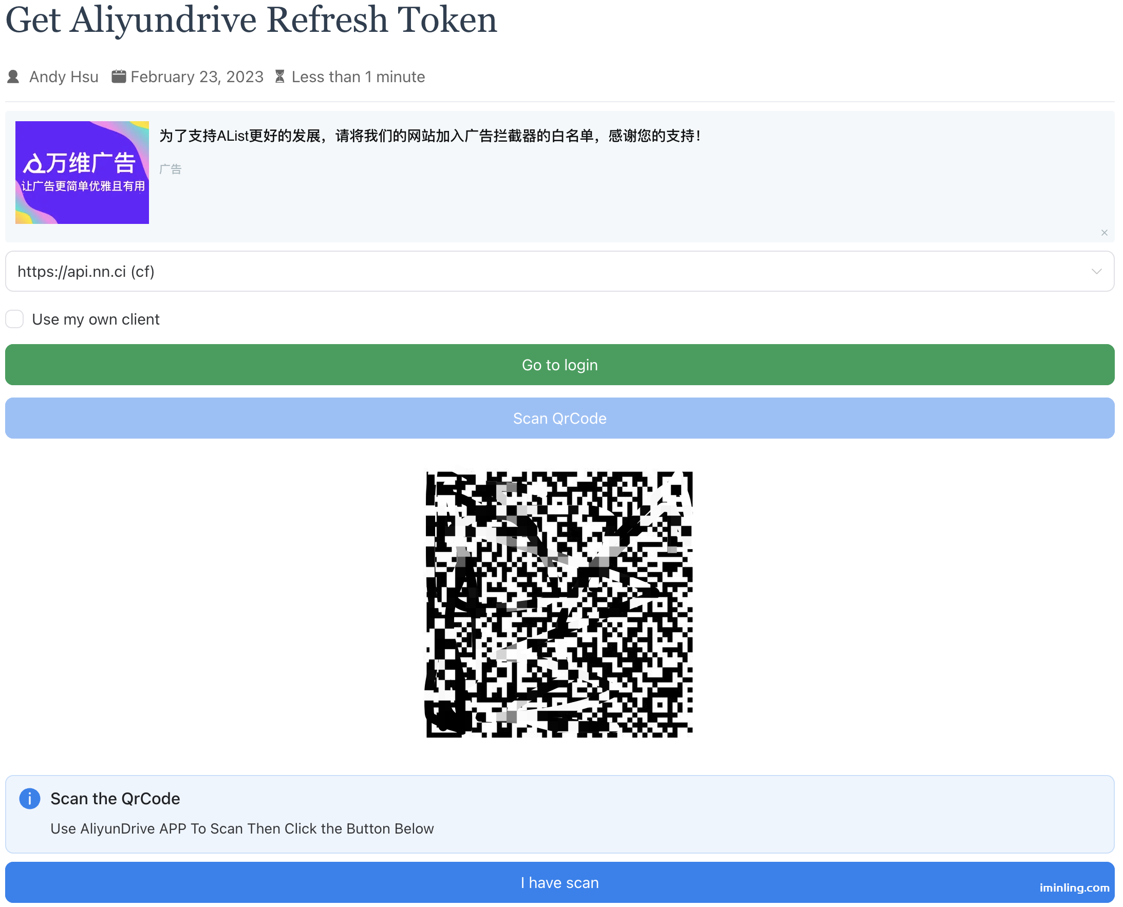 打开网站:Get Aliyundrive Refresh Token,首先点击Scan QrCode获取二维码,然后使用手机端阿里云盘扫描,扫描完成后再点击I have scan 来获取refresh token。同时记录下这个token。