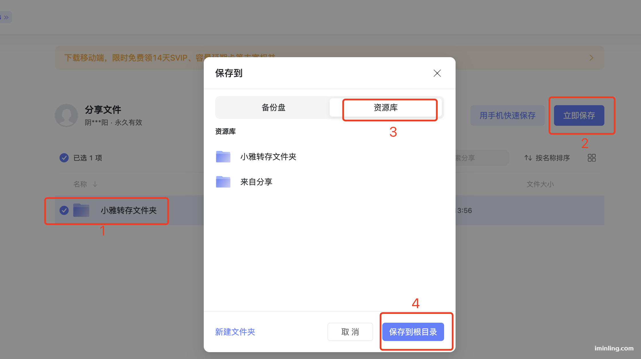 打开小雅的分享地址:https://www.alipan.com/s/rP9gP3h9asE,将里边的内容转存到自己的网盘下,选择资源库。