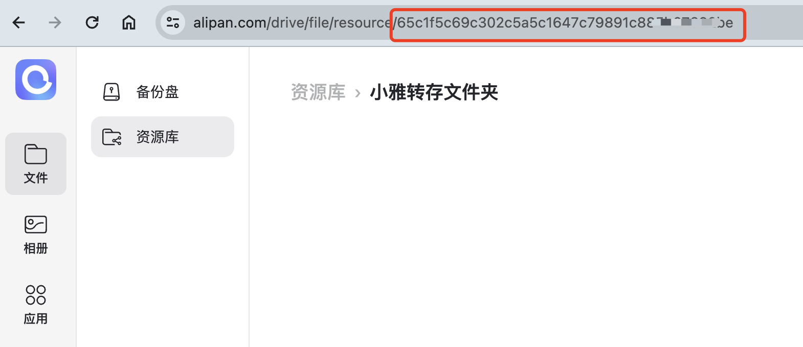 然后进入到自己的阿里云盘,打开刚才转存的目录,看地址栏,最后那一串字符串就是需要的folder id.记录改folder id.
